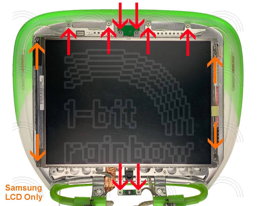 4 x original Apple Philips 3.6mm internal display screws for all the iBook G3 Clamshell ranges. Four secure the LCD panel (Samsung LCD only), four secure the top of the display chassis, three secure the inverter board, and two secure each of the antenna board and sleep light board.