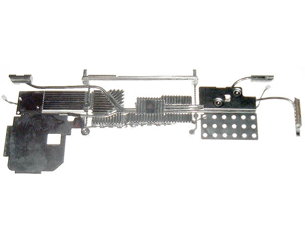 Internal processor heat sink for the 667MHz (DVI), 800MHz, 867MHz & 1GHz models of Titanium PowerBook G4. This metal assembly carries heat away from the processor to keep it cool. It must be sealed to the processor chip with some form of thermal compound.