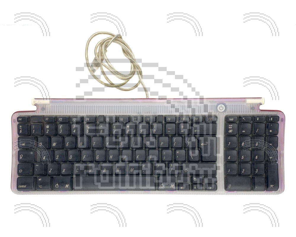 Original Apple strawberry pink coloured USB external keyboard. This was originally suppled with the iMac G3 but can be used on any USB equipped Mac. This keyboard has an integrated power-on button but does not feature an eject key.