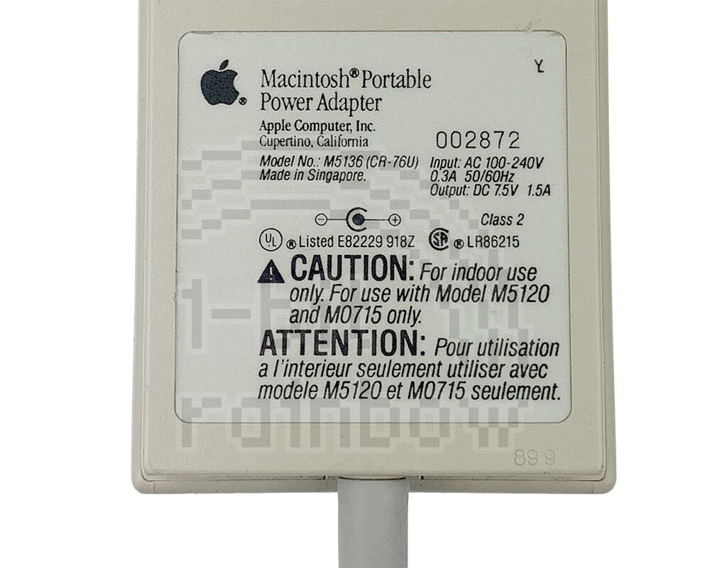 Original Apple, fully tested, 7.5v 1.5A charger for the Macintosh Portable with UK mains plug. Never connect the Portable to a charger that is rated at more than 1.5A or you may damage the logic board. Although the Portable may work using a charger with no main, functioning battery present, doing so should be avoided for any length of time as this can damage the logic board.