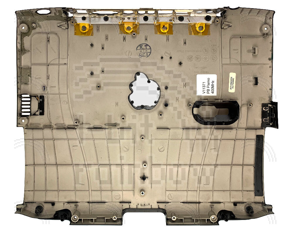Complete bottom case from a 400MHz PISMO PowerBook G3. Although it specifically states 400MHz on the label, it is physically interchangeable with the 500MHz version.