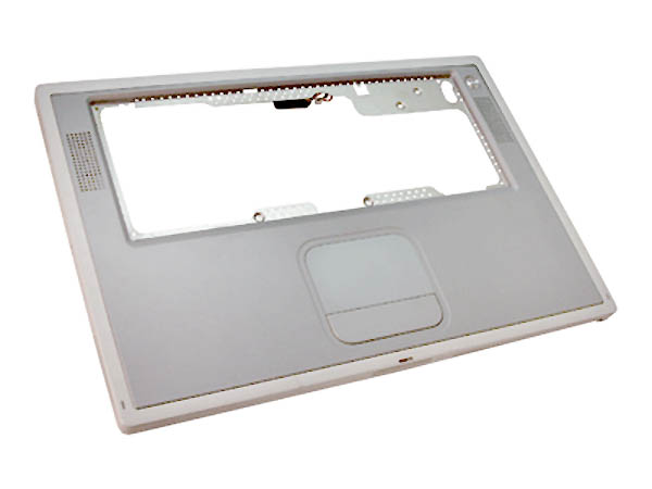 Complete top case for 550MHz & 667MHz (non-DVI) models of Titanium PowerBook G4. This unit icludes the power button, speakers, trackpad, trackpad button, trackpad flex cable, AirPort antenna and PMU board.