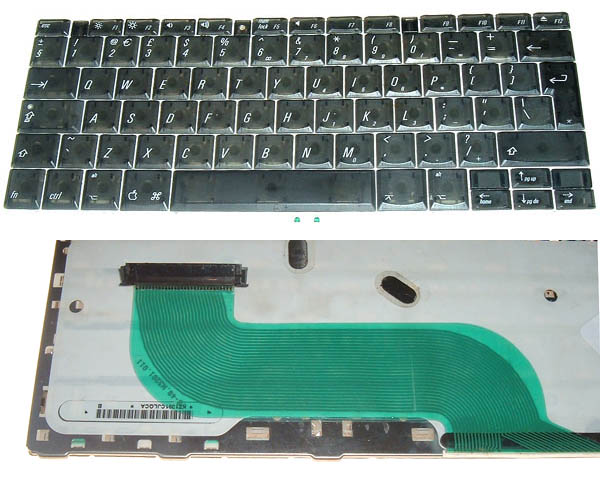 US layout internal keyboard module for the 550MHz and non-DVI 667MHz models of Titanium PowerBook G4. Please note that this is not the correct keyboard for the DVI 667MHz model. The different models of keyboard can be determined by the flex cable (see photo).