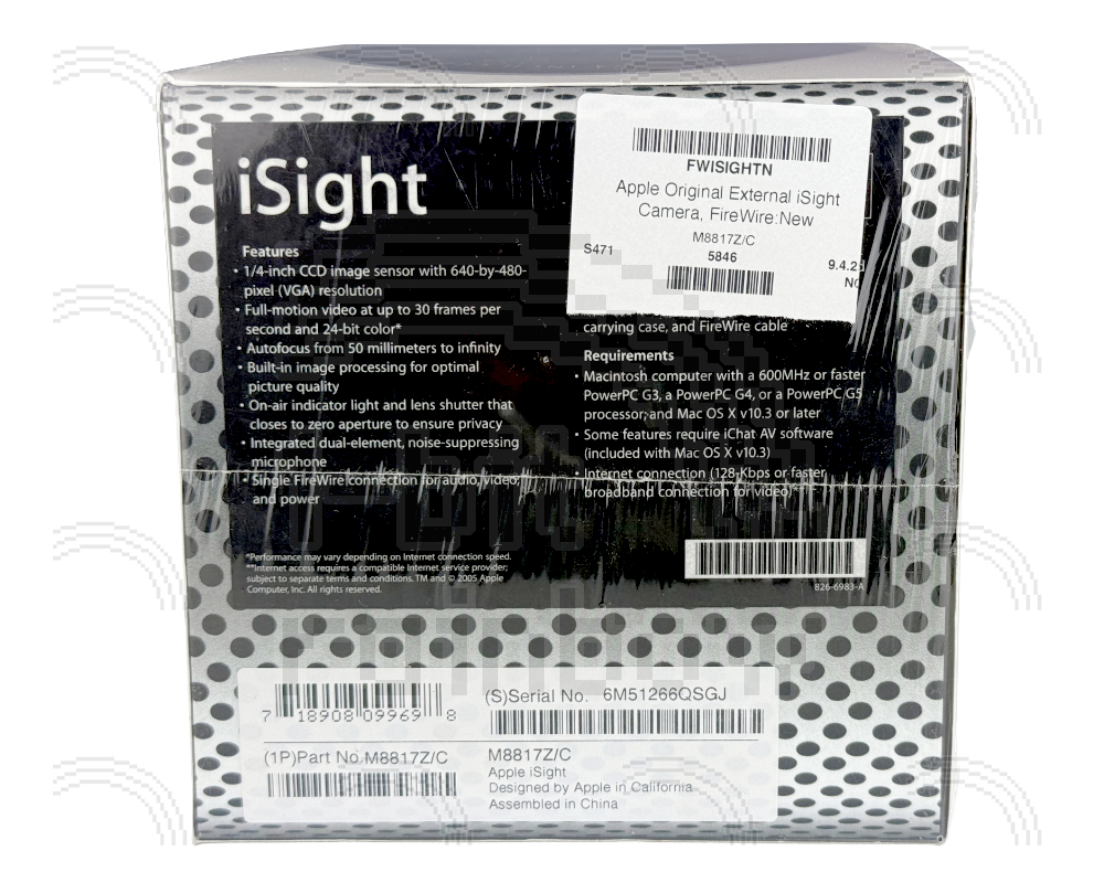 Brand new, sealed Apple iSight camera. This is the original "iSight" camera designed for use with iChat AV.
