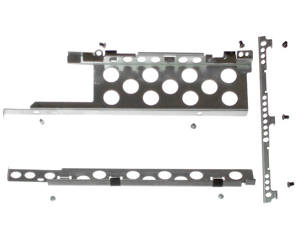 Set of three optical drive mounting brackets plus screws for all PowerBook G4 15" models. The set comprises the left, front and right hand brackets, the 4 drive screws (2 for the left and right bracket to fix them onto the optical drive), the 2 right hand bracket mounting screws which fix the whole unit into the PowerBook G4 chassis, and 3 to hold the front clamping bar in place. It is not supplied with the left hand bracket mounting screws as the this bracket is secured by the hard drive mount screws. It is important that the screws are used in the correct position. Please refer to the photo which shows each screw next to where it should go.