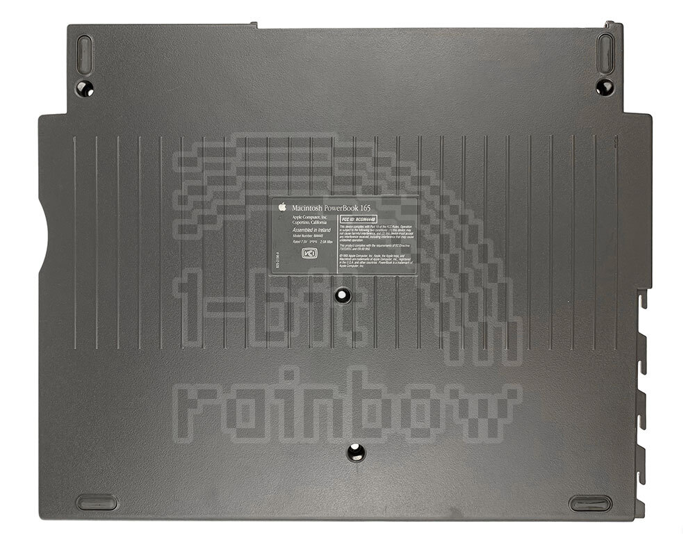 Original Apple bottom case with metal chassis and backing sheet for the PowerBook 165. Although this has the PowerBook 165 model label, the bottom case is physically interchangeable with the PowerBook 160, 165c, 180 and 180c.