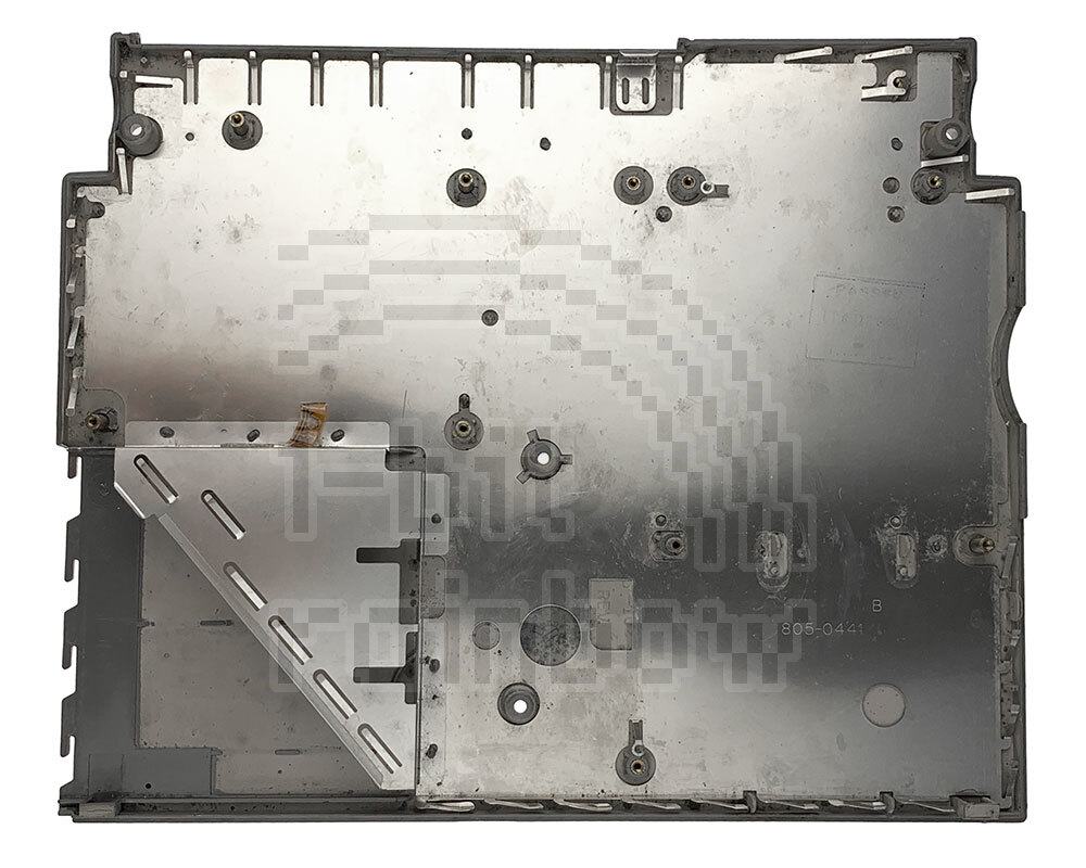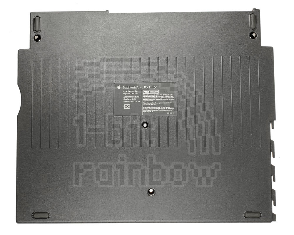 Original Apple bottom case with metal chassis and backing sheet for the PowerBook 165c. Although this has the PowerBook 165c model label, the bottom case is physically interchangeable with the PowerBook 160, 165, 180 and 180c.